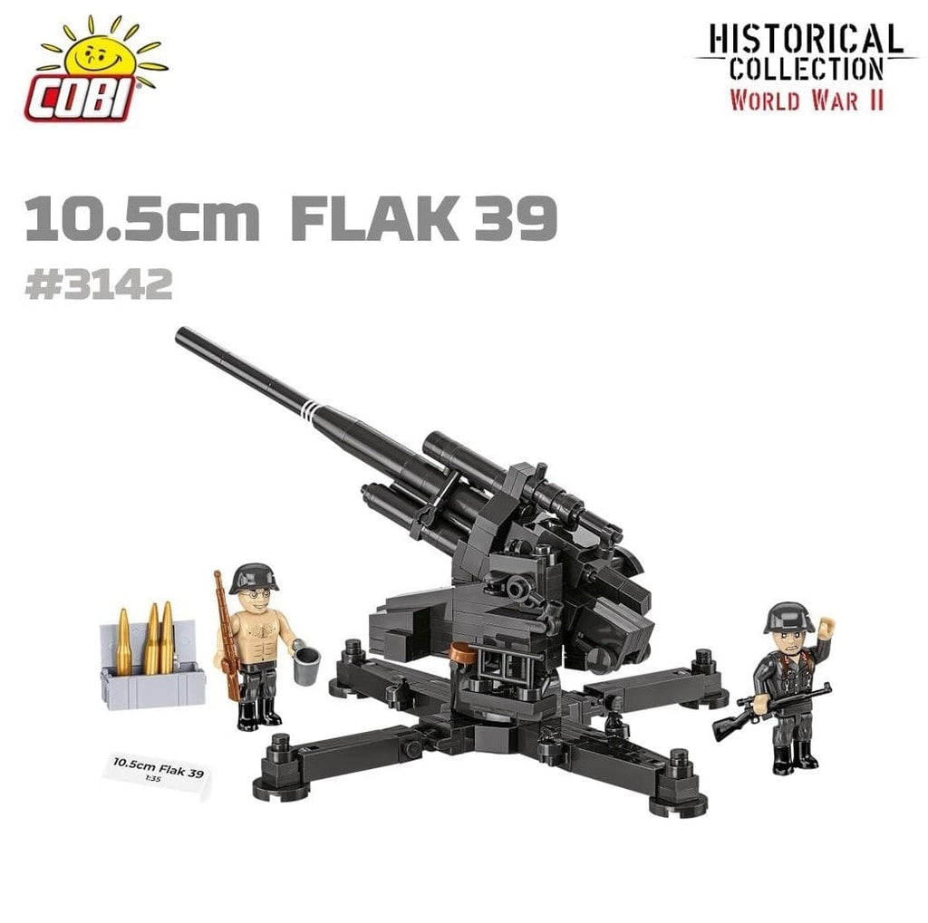 The 10.5 cm FlaK 39 was a German heavy anti-aircraft gun developed during the Second World War to improve on earlier FlaK designs. It fired a 105 mm shell capable of reaching high-altitude Allied bombers, making it effective against aircraft flying beyond the range of lighter guns such as the 8.8 cm FlaK. The weapon featured a longer barrel and improved fire-control integration, allowing for better accuracy and faster target acquisition. It could be deployed on a static mount for air defence of cities and industrial areas, or on a mobile carriage for field use. Although powerful and accurate, the FlaK 39 was complex and expensive, limiting the number produced compared with smaller anti-aircraft weapons.